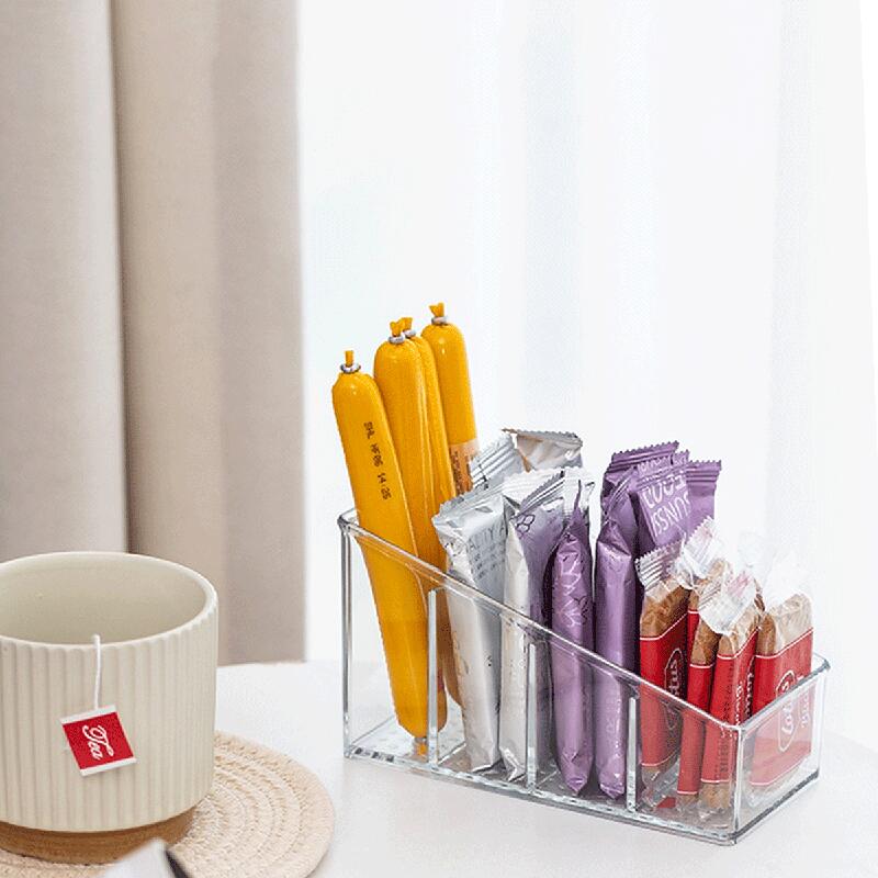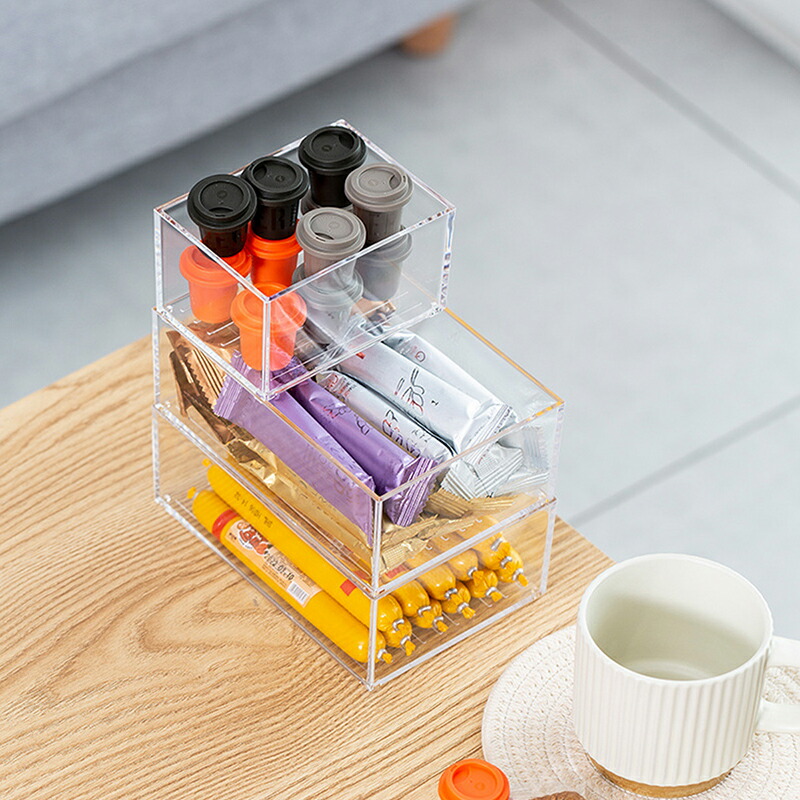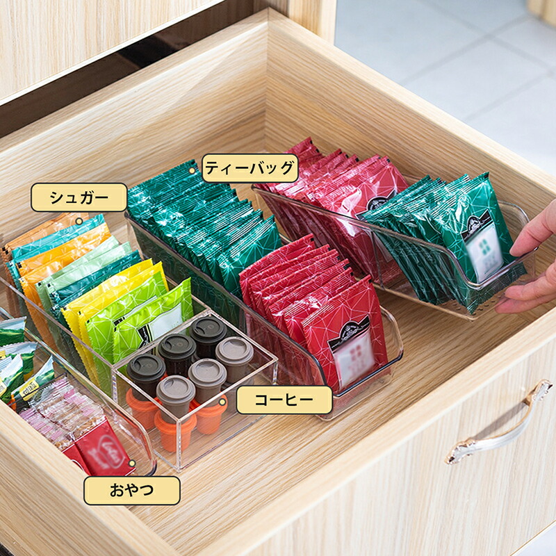 ■紅茶やお茶のティーパックだけでなく、砂糖やスティックコーヒー、ドッリップコーヒーなどのカフェセットをまとめておきたい場合はボックスタイプが活躍します。透明タイプの収納グッズは在庫量を把握しやすく、圧迫感がないのが嬉しいポイント。