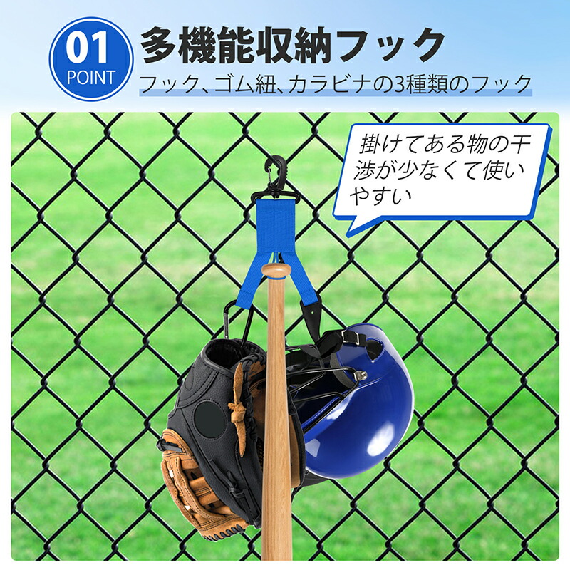 収納フック 多機能 3WAY 吊り下げ収納 カラビナ・S字・ゴム紐一体型 野球用品 グローブ・バット・ヘルメット対応 省スペース ナイロン 屋内外対応 アウトドア ガーデン 便利グッズ