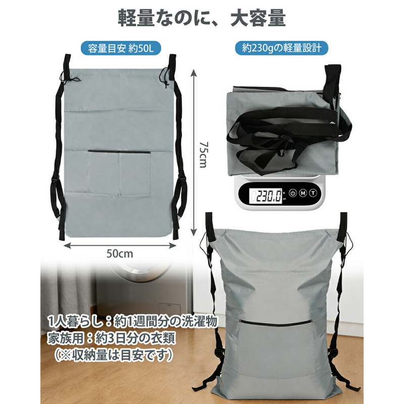| 【背負える・掛けられる2WAY】 | 背負って運べるリュックタイプと、ドアやポールに掛けて使える吊り下げタイプの2WAY仕様。洗濯機まわりでの一時保管から、物干し場までの持ち運びまで、この一つで対応できます。洗濯かごを床に置かずに使えるため、洗面所や脱衣所をすっきり使いたい方に適しています。 |