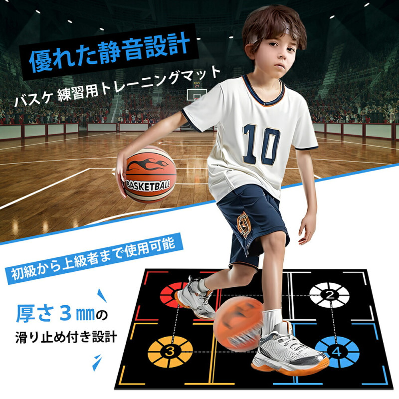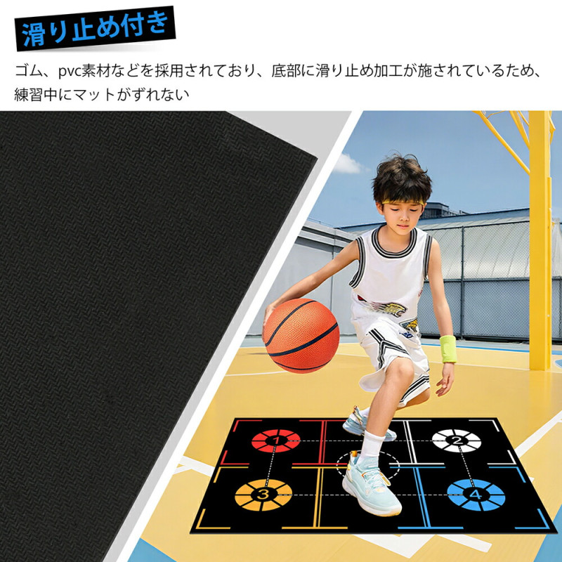 | 【滑り止め加工で安定練習】 | 裏面に滑り止め加工を施しているため、激しいフットワークやドリブル時でもマットがずれにくく、安定した練習環境をご提供。室内でも安心してご利用いただけます。 |