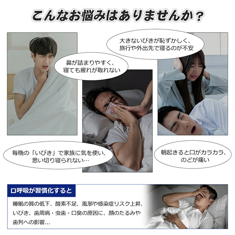 | 【磁力サポートで鼻腔をしっかりキープ】 | 磁石を内蔵した4サイズ展開のノーズバンド。鼻の形状に合わせて選べるから、ぴったりのフィット感が得られ、就寝中のずれを防止。磁力が鼻翼を適度に支え、気道を確保し、いびきの原因となる「鼻詰まり」と「口呼吸」を防ぎます。 |