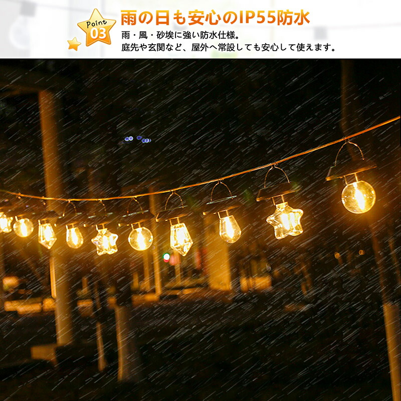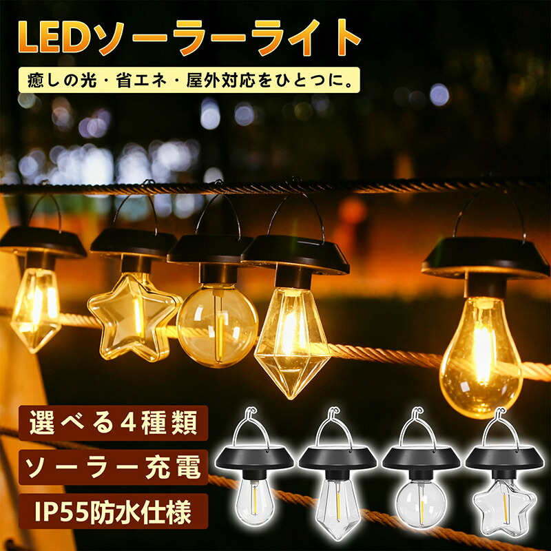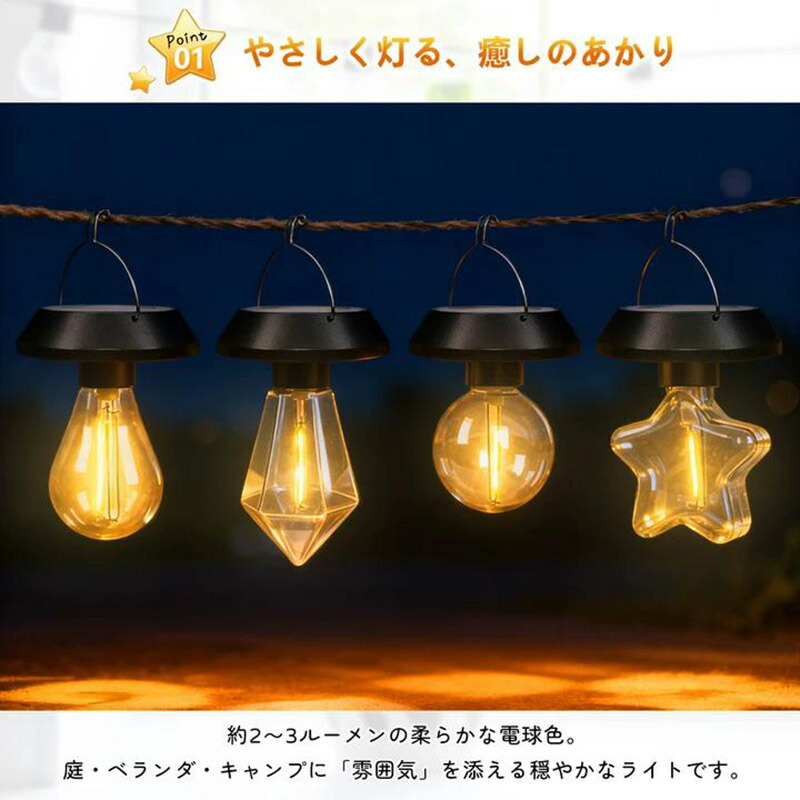 【4種類デザイン】楕円形・ダイヤ型・円形・星形の4デザインを展開。直径約9cmの小型サイズながら、形状ごとの光の表情を楽しめ、庭・ベランダ・花壇・アプローチなど幅広く調和します。複数セットで統一感のあるレイアウトも可能です。 【やわらかな電球色】光量は約2~3ルーメンの控えめ設計。強い照明ではなく、庭の植栽やベランダ、キャンプサイトに寄り添う「雰囲気重視」の柔らかな灯りを演出します。常夜灯や装飾ライトにも最適です。 【自動充電&自動点灯】太陽光パネルで日中は自動充電、夜間は自動点灯。約6~8時間の充電で6~12時間点灯します。(※使用時はスイッチON)配線不要で、屋外に設置するだけの簡単使用です。 【IP55防水仕様】雨・風・砂埃に強いIP55仕様で、庭先・玄関・キャンプ場など屋外常設にも対応。梅雨や季節イベントの装飾にも安心して使用できます。 【フック付きで簡単設置】フックで木の枝・ロープ・フェンス・テントポールなどに手軽に吊り下げ可能。庭の演出、アウトドア、イルミネーション、パーティー装飾など多用途で活躍します。 |