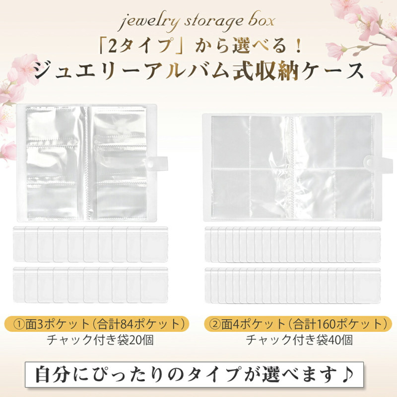 ■品名:ジュエリー収納ケース ■素材:PVC ■サイズ:画像参照 ■内容: 3ポケットタイプ(84ポケット)+チャック袋20枚; 4ポケットタイプ(160ポケット)+チャック袋40枚 |