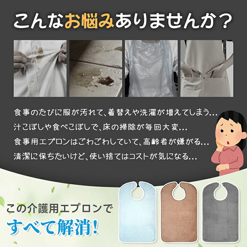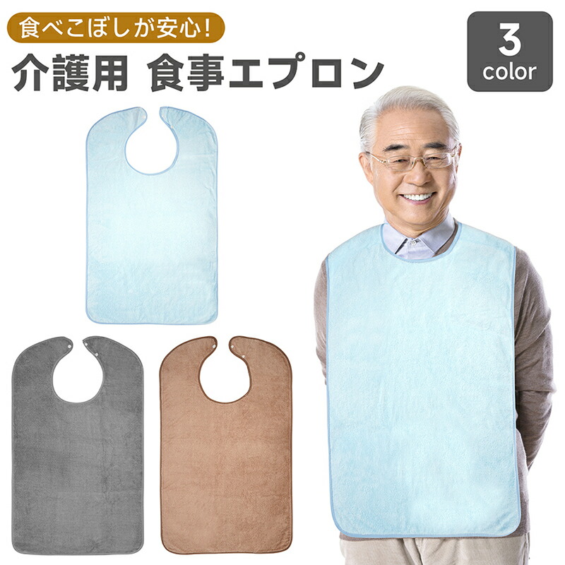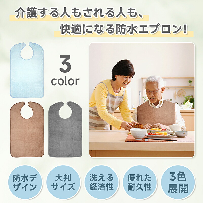 介護用エプロン エプロン 介護 食事用 大人用 高齢者 男性 女性 男女兼用 防水 撥水加工 食べこぼし防止 汚れ防止 大きめサイズ 洗える 繰り返し使える やさしい肌触り 3color