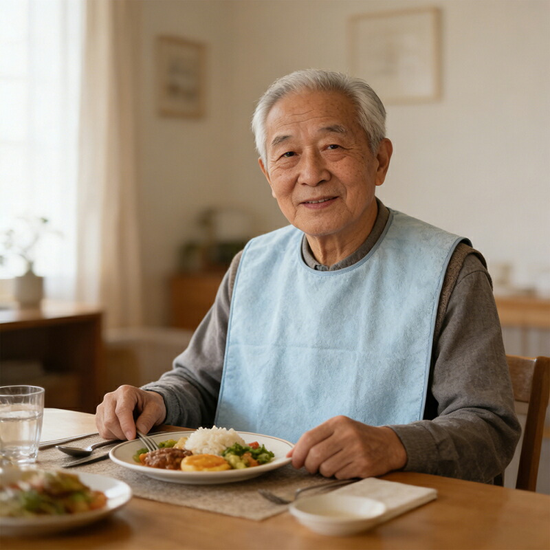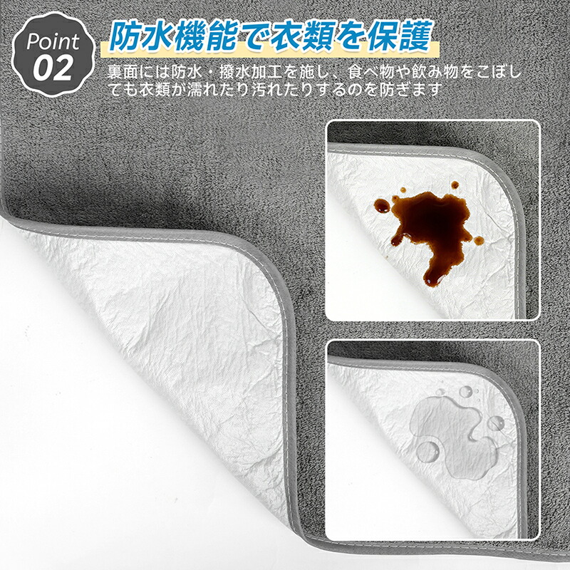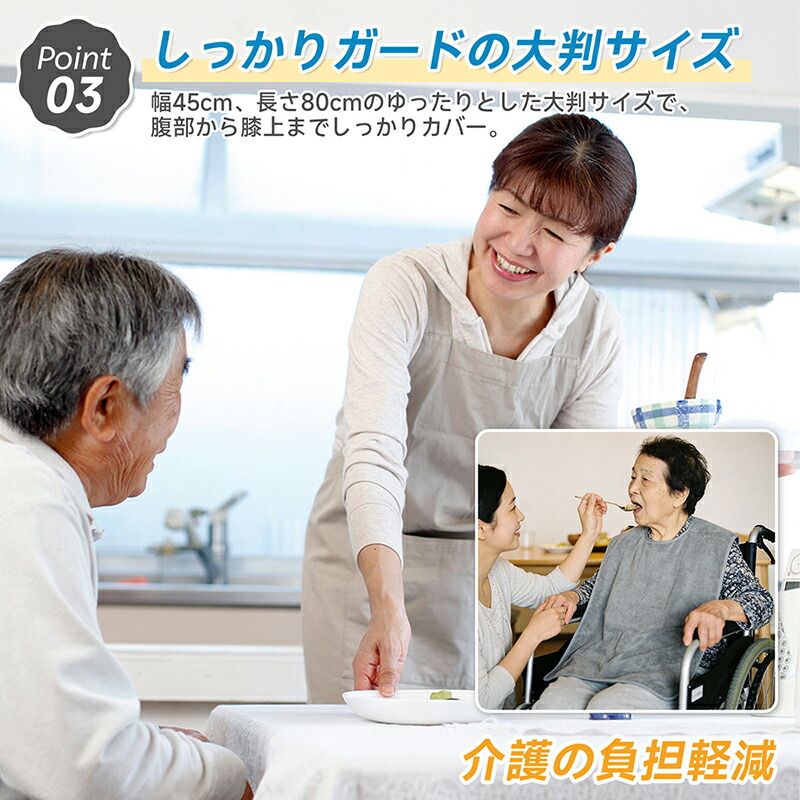| 【大きめサイズでしっかりカバー】 | 食事中の前かがみの姿勢や、ちょっとした動きにも対応できるよう、幅45cm、長さ80cmのゆとりある大判サイズを採用。お腹周りから足元までしっかりとカバーし、床への食べこぼしも防ぎます。体格を選ばず、男性の方にも女性の方にも快適にお使いいただけます。 |