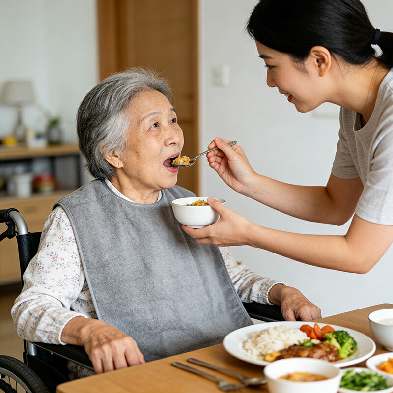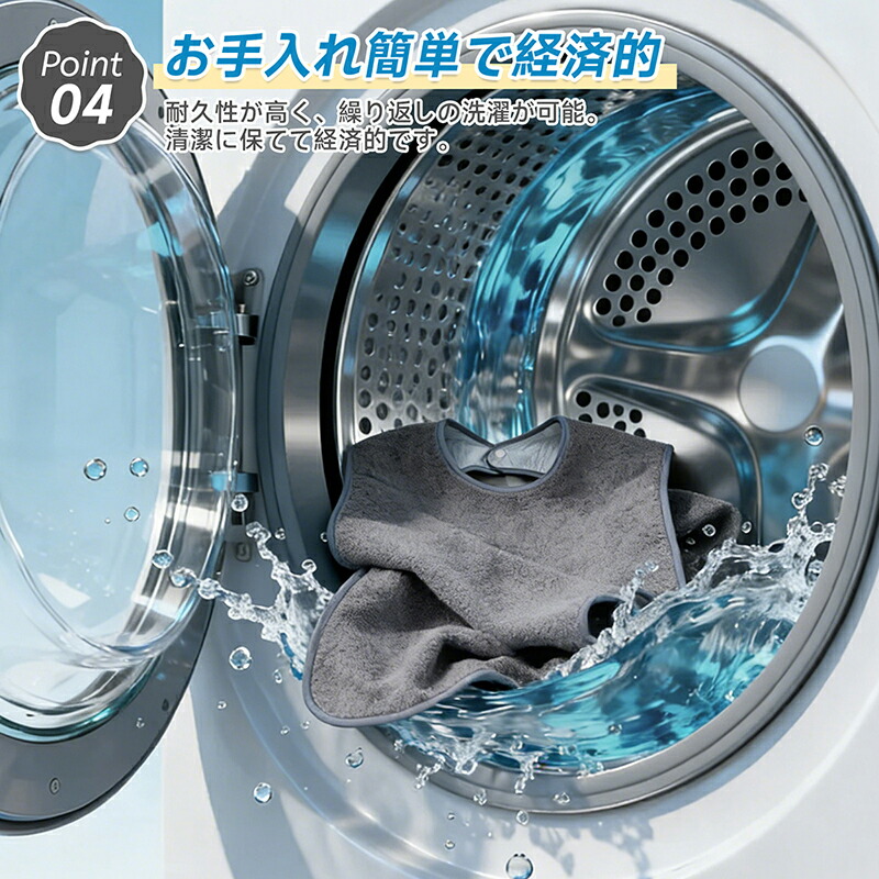 | 【突然のハプニングも安心防水・撥水仕様】 | 食べこぼしや飲みこぼしによる衣類の汚れを防ぐため、裏面にはしっかりとした防水層を設けています。汁物や飲み物がこぼれても、生地の裏側まで染み込まず、サッと拭き取ることが可能。お召し替えの手間を減らし、介護される方、介護される方双方の負担を軽減します。
