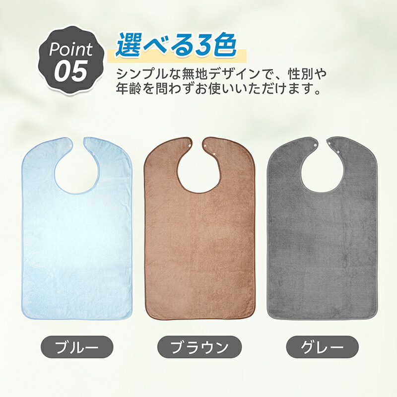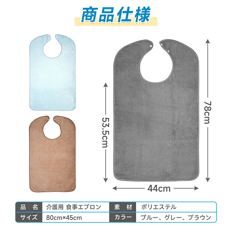 ・品名:介護用 食事エプロン ・素材:ポリエステル ・サイズ:80cm×45cm ・カラー:ブルー、グレー、ブラウン |