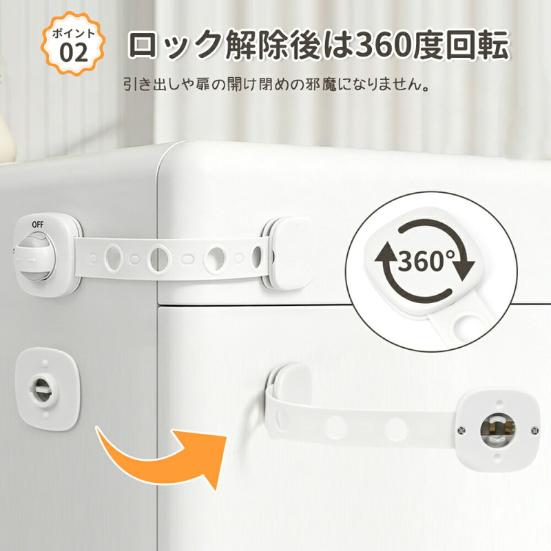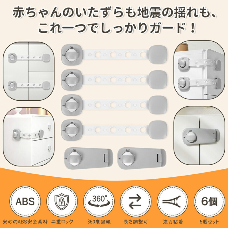 チャイルドロック ベビーガード【6個セット】引き出しロック 二重ロック 長さ調整可能 360度回転 強力粘着 冷蔵庫ロック ドアロック 扉ロック 地震対策 いたずら防止 指挟み防止 工具不要 子供 安全 ストッパー 送料無料