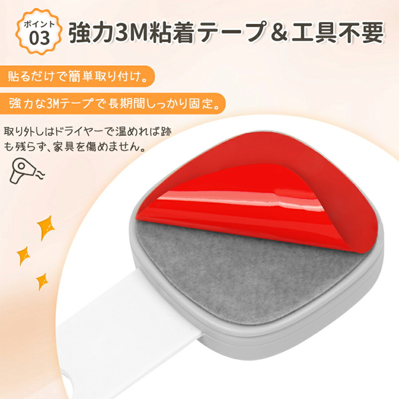 | 【貼るだけ簡単!強力テープでしっかり固定】 | ドライバーなどの工具は一切不要。強力両面テープで、冷蔵庫やキャビネットの表面にしっかり密着。日常の開閉やお子様の引っ張りにも簡単には外れません。お掃除の際などに取り外すときは、ドライヤーで温めながらゆっくり剥がせば、糊跡が残らずキレイです。
